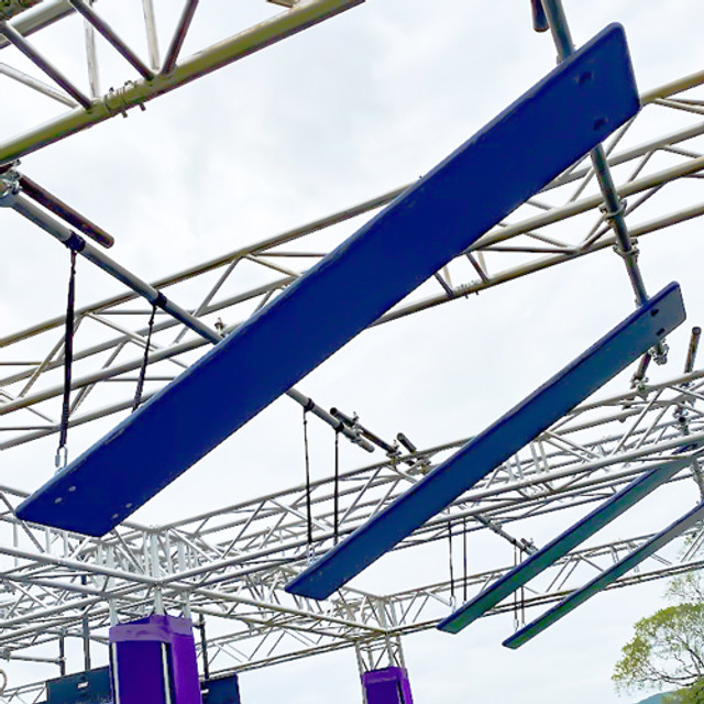 The DEMO Extreme Adjustable Bridge is the perfect way to add an incline or decline challenge to your ninja course. Unlike traditional unstable bridges, the Extreme Adjustable Bridge is fixed so that it will not sway during use. This versatile obstacle features rig-friendly clamps, making it compatible with both 1.25" (1.66" OD) and 1.5" (1.90" OD) pipes. Simply hang one end on a pipe and use the included straps to suspend the other end at your desired angle. The DEMO Extreme Adjustable Bridges are available in blue only.